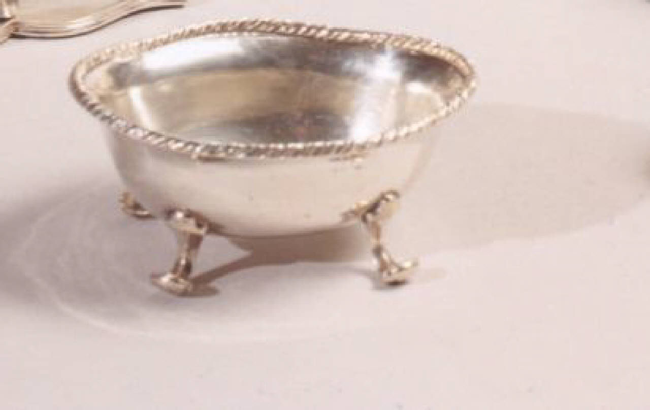 Saliera ovale con bordo a cordoncino e quattro piedini.