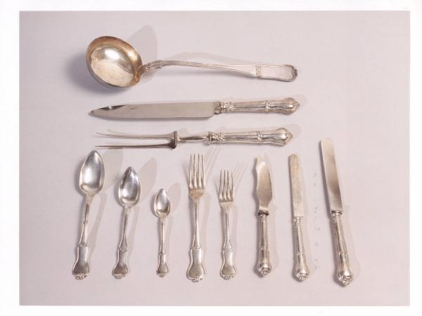 Posate con manico leggermente sagomato e piccolo nodo: 12 cucchiaini, 12 cucchiai da colazione, 10 cucchiai, 23 forchette, 23 coltelli grandi, 10 coltelli piccoli, 11 forchette da frutta, 1 coltello grande, 1 forchettone, 1 coltello pesce, 1 mestolo.