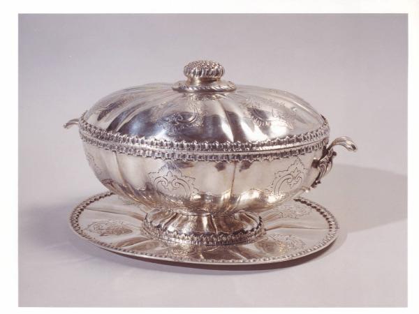 Zuppiera poggiante sul suo piatto, sormontata da coperchio con pomolo a forma di fiore; piccoli manici laterali. Decoro inciso con motivo a foglie, bordo a rilievo con decoro a piccole foglie.