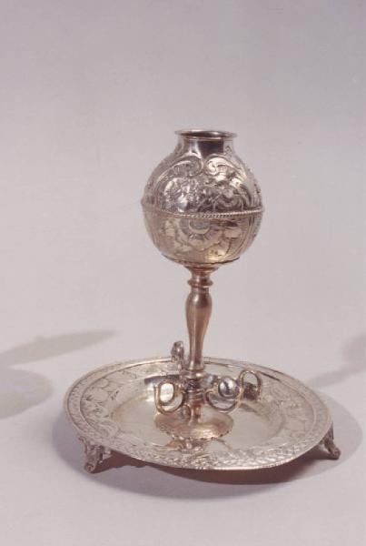 Probabile bruciaprofumi: alto fusto con corpo circolare cesellato e largo collo; piede a riccioli poggiante su un piatto sostenuto da tre piedini a foglia.