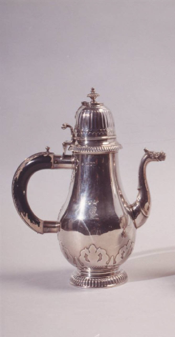 Caffettiera con piede tondo con bacellatura, manico in legno, beccuccio con testa di animale fantastico e coperchio con decorazione ovale; finale a piccolo pomolo.