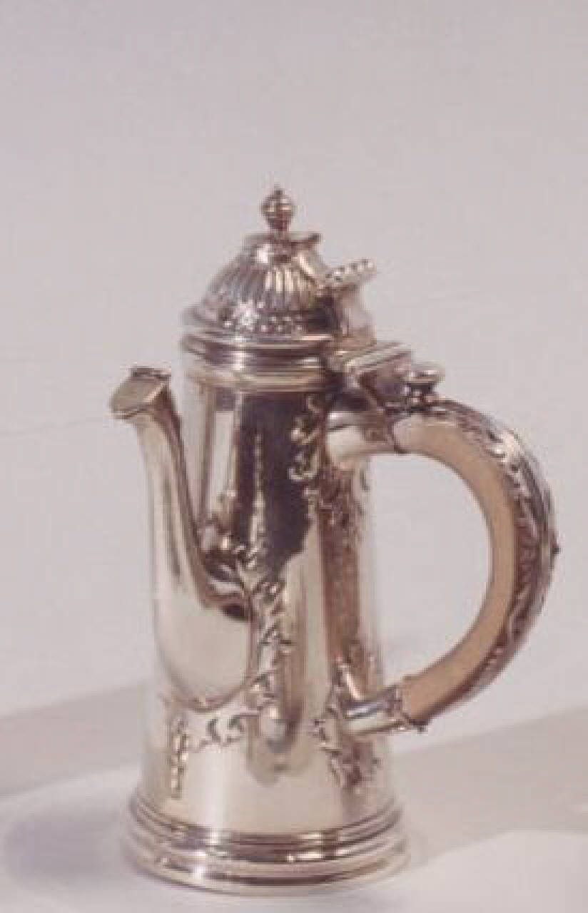 Caffettiera e lattiera in argento con decori applicati, coperchi incernierati e decorati con bacellatura; manici in legno con parte superiore decorata in argento.