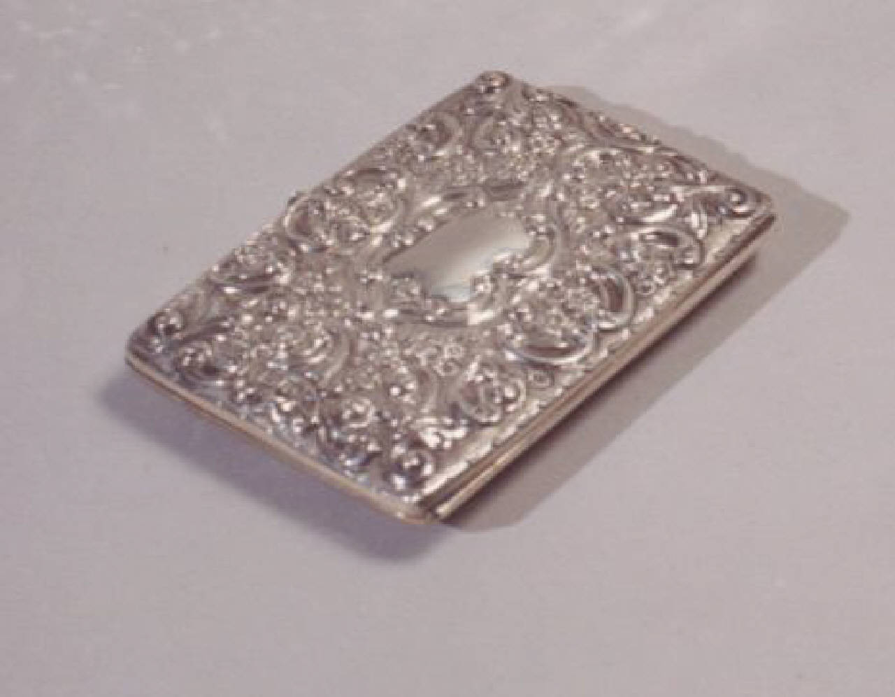 Portabiglietti da visita con lavorazione a cesellatura con motivi ornamentali fogliati.
