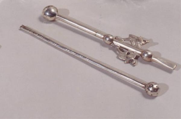 Bastoncini da cocktail in argento con semplici lavorazioni: una con pallina con piccoli fori e l'altra con pallina piena con motivo ornamentale a forma di foglia.
