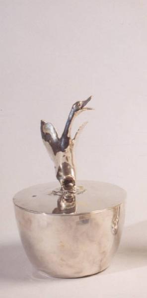 Scatola in argento con coperchio a incastro sormontato da un'anatra ad ali spiegate.