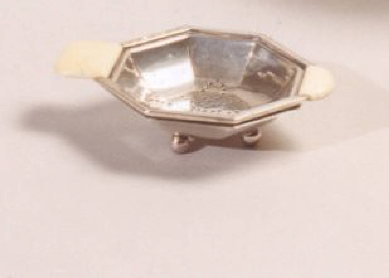 Colino ottagonale corredato dal suo piattino sempre ottagonale poggiante su piedini.