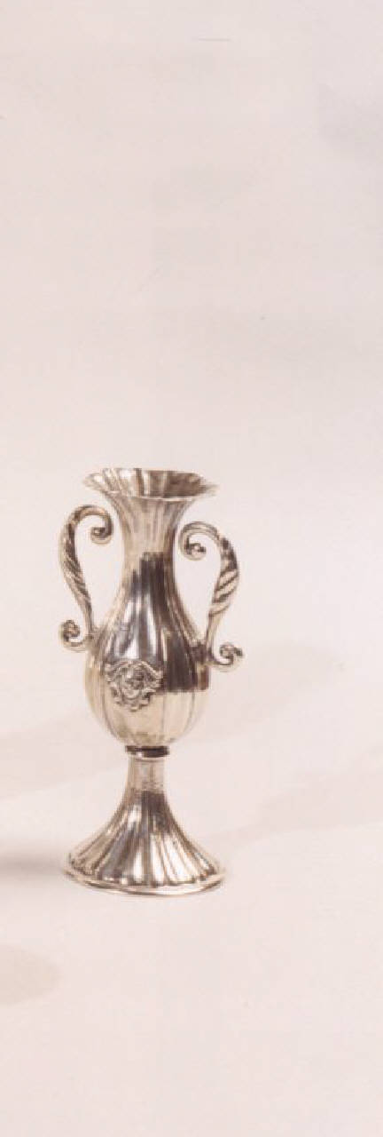 Coppia di vasetti monofiore con corpo decorato, anse laterali con la stessa decorazione.
