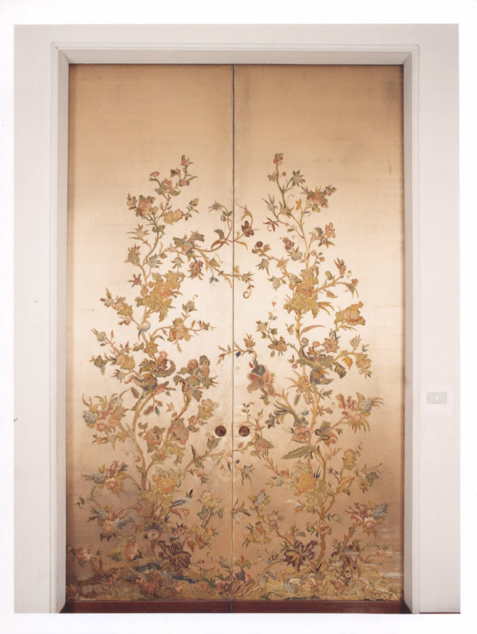 Porta scorrevole interna a doppio pannello rivestita di seta con prezioso ricamo a punto pieno e a fili policromi con motivo decorativo a tralcio fiorito.