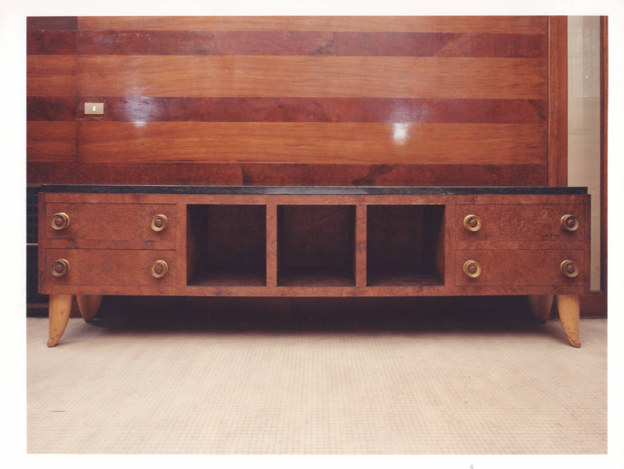 Credenza realizzata in legno, in essenze differenti, composta da un mobile contenitore sormontato da un piano, organizzato con una coppia di cassetti posti nelle parti laterali, e tre vani a giorno in quella centrale.