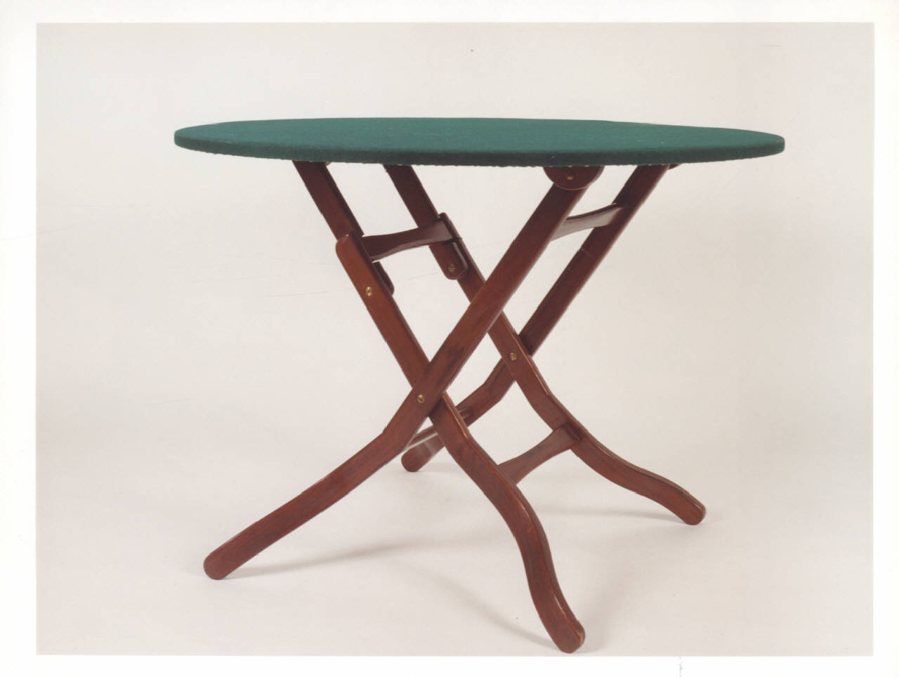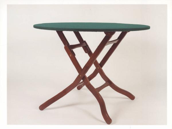 Tavolo da gioco rotondo pieghevole con cerniere in metallo, sostegni a cavalletto.