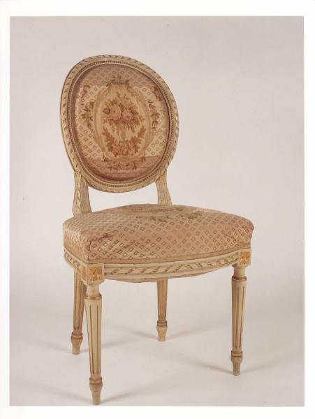 Quattro sedie in stile Luigi XV, ma prodotte più tardi, in legno laccato oro e bianco; schienali rotondi e seduta rivestiti in seta ricamata a motivi floreali, sostegni rastremati con piccole scanalature.