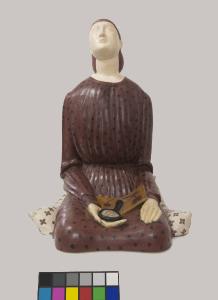 L¿opera a tutto tondo in gesso policromo rappresenta una donna seduta in ginocchio su un cuscino tiene in mano uno specchio, in grembo un libro aperto e rivolge il volto attonito verso l'alto, lasciando la bocca semi aperta.