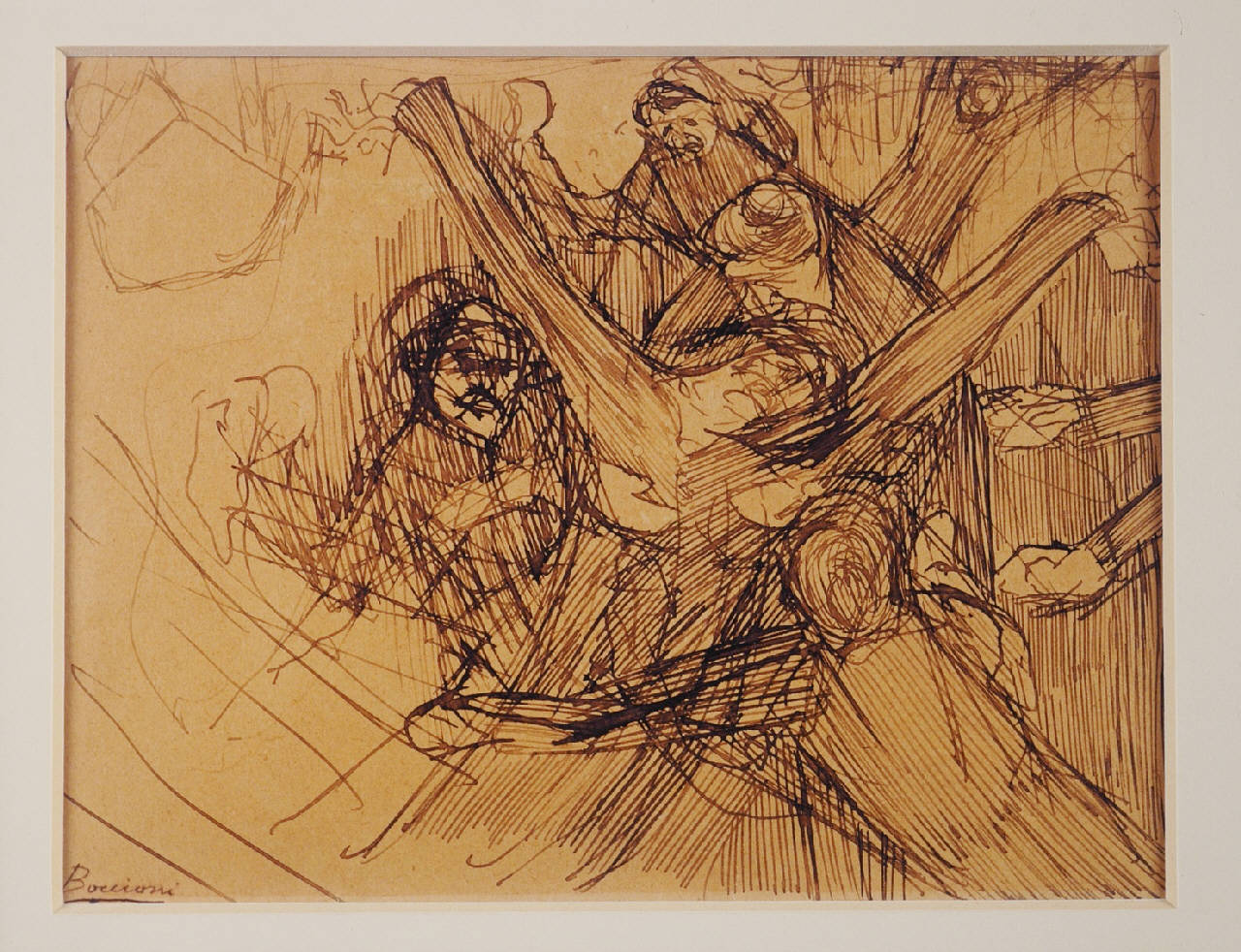 - NOTIZIE STORICO CRITICHE L'opera donata da Claudia Gian Ferrari al FAI è la seconda versione di bozzetto che si trasformerà poi nel 1910 nell'opera "Il lutto" di Umberto Boccioni, oggi in collezione privata. Se la prima versione partiva da un'iconografia più tradizionale questa seconda versione mette al centro le donne piangenti intente a sorreggere la persona più disperata del gruppo, riversa all'indietro sulle altre con le braccia aperte quasi fino a distorcerle. Mettere al centro il punto di origine della disperazione permette a Boccioni di giocare su una composizione totalmente nuova, dilaniante, che deflagra dal centro dell'opera spazzando via tutto il resto: la bara che viene portata via nell'angolo in alto a sinistra, le due parti semivuote a sinistra e destra nel disegno che chiudono e serrano la composizione e che diverrano poi nella versione finale cuscini di fiori. Recenti studi (F. Fergonzi, Boccioni verso il 1910, qualche fonte visiva, in "L¿uomo nero. Materiali per una storia delle arti della modernità ", I [2], 2004, pp. 15-37) hanno ricondotto lo schema e la resa de "Il lutto" alla conoscenza di opere grafiche di "Käthe Kollwitz" (in particolare un foglio del Bauernkrieg), per il motivo delle braccia levate delle donne, e di Félix Vallotton (il disegno "Le mauvais pas") per quello dei necrofori.