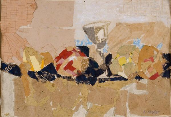 - NOTIZIE STORICO CRITICHE La "Natura morta" di Fausto Pirandello donata al FAI da Claudia Gian Ferrari racconta delle sue diverse esperienze artistiche nel dopoguerra. L'interesse per le nature morte inizia certamente nei soggiorni parigini dove Pirandello conosce il cubismo e resta particolarmente colpito dal lavoro di Braque che rimarrà per lui un maestro. Questa serie di opere sono l'occasione per un rinnovato interesse materico che porta però con sé un'ulteriore scomposizione formale dovuta ai tagli e agli strappi delle carte. È il colore di queste ultime, insieme ai tocchi di pastello, a creare la composizione per contrasti cromatici, collocando questa natura morta nella scia della tradizione francese cubista. Sul retro del collage Pirandello aveva realizzato un autoritratto ora visibile dopo il ritrovamento durante il restauro del 2016.