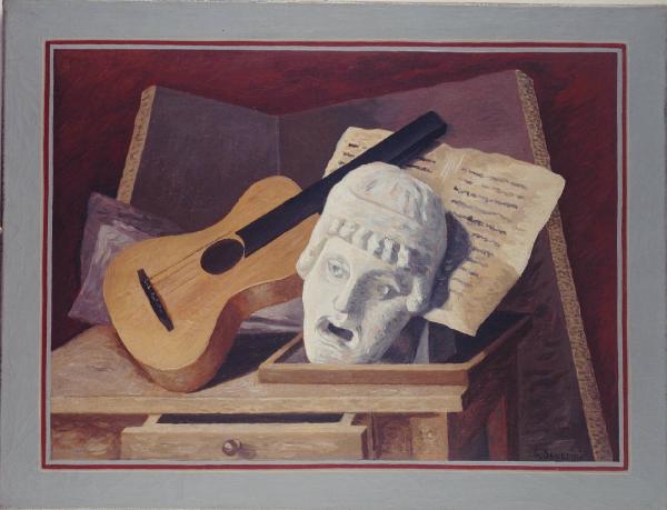 - NOTIZIE STORICO CRITICHE Severini, pittore dell'avanguardia futurista, subisce alla fine degli anni Venti sempre di più il fascino per il passato e l'ordine, la natura morta donata al FAI da Claudia Gian Ferrari è un esempio di questo "ritorno all'ordine". È proprio dall'anno precedente quest'opera che la natura morta riprende spazio nella produzione di Severini: appena rientrato in Francia dopo un soggiorno svizzero è infatti naturalmente vicino al gruppo degli "Italiens de Paris" (Tozzi, Campigli, de Pisis, de Chirico, Savinio, Paresce), dove si tenta di coniugare l'avanguardia al classicismo mediterraneo, dove l'ispirazione dall'antico permea la vita degli oggetti quotidiani in dialogo. La passione per il teatro diventa qui l'oggetto privilegiato della composizione fin quasi a dominarla: una spiecie di scenografia, una partitura illeggibile, una chitarra, una maschera del teatro sono posati su un tavolo con un cassetto aperto. Ne risulta una composizione piena, tanto da negare lo spazio che la ospita, e sospesa come la bocca aperta della maschera da cui non esce suono, la chitarra con le corde in dissolvenza e lo spartito illeggibile.