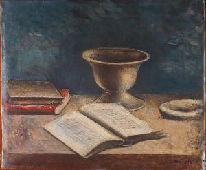 Natura morta su un piano con libri, calice e ciotola in olio su tela.