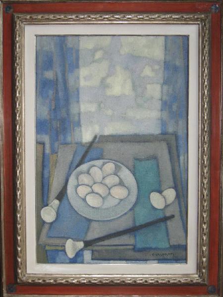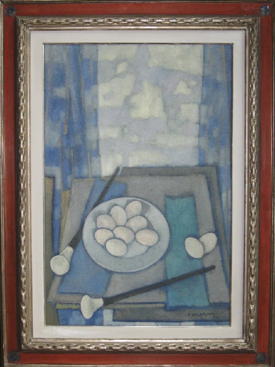 - NOTIZIE STORICO CRITICHE L'opera è stata donata al FAI da Gioia Falck, moglie dell'imprenditore fiorentino Carlo Marchi. Il dipinto rappresenta otto uova in un piatto collocate sopra un piano, su cui poggiano anche alcune figure irregolari, altre due uova e due flauti. La composizione è giocata sulla gamma cromatica prevalente del blu. Lo spazio, raccontato da un punto di vista rialzato, è reso dall'incrocio delle linee di fuga presenti nel piano con le linee verticali della parete di fondo: si genera così uno spazio tanto reale quanto inabitabile. Il soggetto rivela inequivocabilmente la mano di Casorati, confermata dalla firma in basso a destra. Il tema della natura morta con uova è infatti ricorrente nella sua produzione artistica. In questo caso si accompagnano alle uova due oggetti identificabili con dei flauti, come in altre composizioni dell'artista (es. "Piatto e flauti" passata all'asta nel novembre 2013 - Vienna, Palais Dorotheum, Lotto N. 1368). L'opera è estremamente silenziosa e impenetrabile. È tipico del Realismo Magico di Casorati la presenza di oggetti noti e famigliari che sono però accostati gli uni agli altri a creare situazioni indesiderabili o spazi inabitabili. L'opera risulta così carica di attesa, e le semplicissime e quotidiane uova così come gli armonici flauti da oggetti si fanno oggettivizzazioni sentimenti e pensieri dell'autore ieri e dell'osservatore oggi.