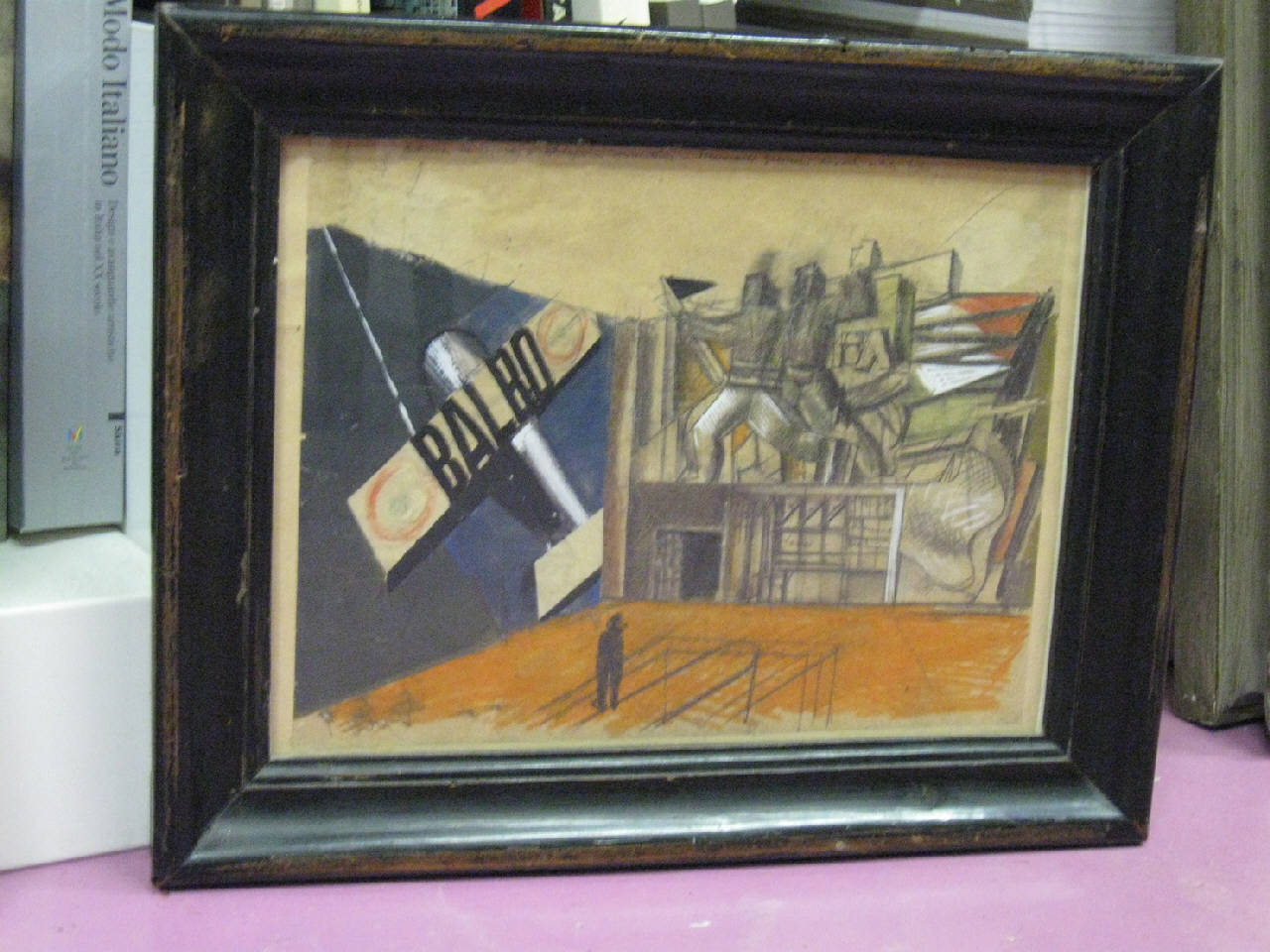 - NOTIZIE STORICO CRITICHE Lo studio di Sironi donato al FAI da Claudia Gian Ferrari è riconducibile all'allestimento della "Mostra della Rivoluzione Fascista" inaugurata a Roma a Palazzo delle Esposizioni nel 1932, dichiarata permanente dallo stesso Mussolini nel 1933 e successivamente rielaborata nel '37 e nel '42. Pensata su diciannove sale tematiche nel solo primo piano organizzate cronologicamente dalla A alla U è stata la mostra, la più vista di tutto il secolo, con più di quattro milioni di visitatori, la più grande "fabbrica dello spettacolo fascista". Ogni sala venne affidata a uno dei maggiori artisti e architetti del regime, a Sironi - che pur era alla sua prima esperienza architettonica completamente autonoma - toccarono quattro delle sale più importanti: le sale P e Q, il Salone d'Onore e la Galleria dei Fasci. Gli studi preparatori per definire l'allestimento museografico sono numerosi, pur mantenendo la personalità di ciascuno gli artisti dovevano infatti attenersi a una serie di elementi per garantire la coerenza dell'insieme: vetrine, cimeli, scritte a parete, immagini\nvimentate da\npresente tra inni e registrazioni. Lo scopo era di immergere i visitatori in un'esperienza indimenticabile, l'opera d'arte totale tanto sognata dalle avanguardie storiche di inizio secolo. Il disegno in oggetto presenta uno studio per la sala P dedicata alla "Marcia su Roma". Lo studio risale probabilmente a una primissima idea progettuale, distante dalla soluzione finale: una vetrina attorno a cui far girare il percorso di visita con alle pareti due camicie nere, elemento che rispetto alle soluzioni finali sembrerebbe avvicinare questo studio alla sala adiacente nonostante l'iscrizione presente. L'aereoplano sulla sinistra, anch'esso non presente nell'allestimento finale, si riferisce alle traversate di Italo Balbo, allora Ministo dell'Aviazione, insistendo quindi sull'aviazione, uno dei temi più cavalcati dalla propaganda fascista.