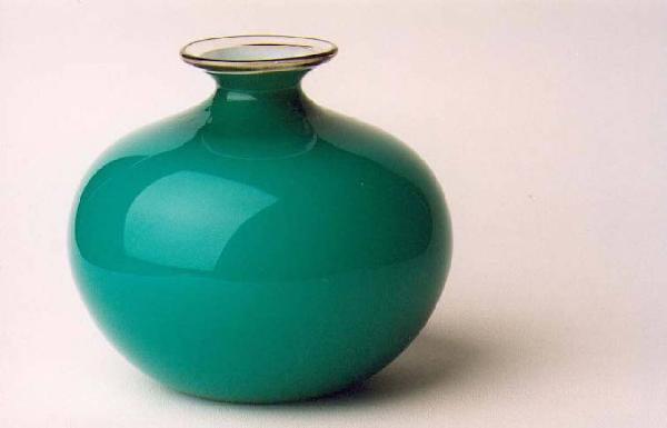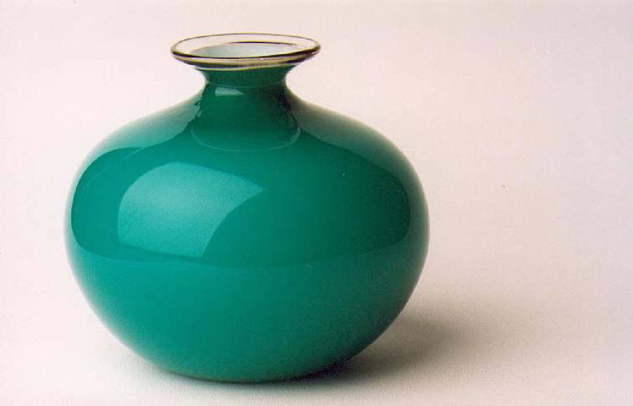 Vasetto Monofiore in vetro opalino incamiciato colore verde e lattimo, realizzato dalla vetreria Venini di Murano.