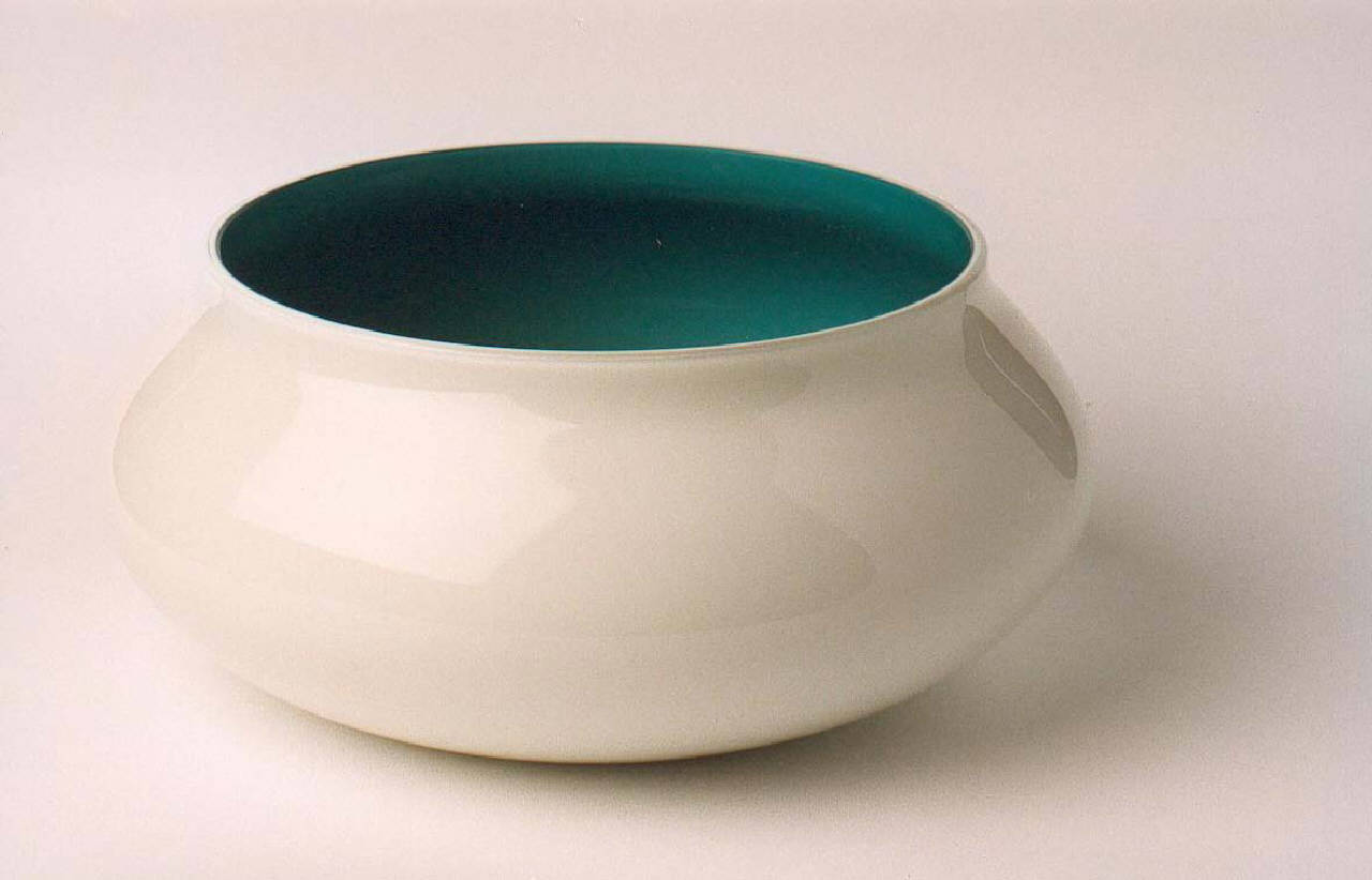 Vaso in vetro opalino incamiciato color avorio e orizzonte, realizzato dalla vetreria Venini di Murano.