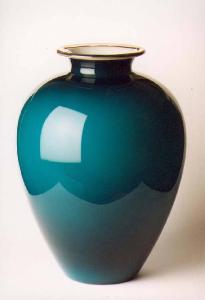 Vaso in vetro opalino incamiciato colore verde e lattimo. Realizzato dalla vetreria Venini di Murano, appartiene formalmente ai modelli, di realizzazione più recente, di vasi in vetro opaco soffiato e lavorati a mano dell\na serie ¿Opalini¿ ideata da Paolo Venini.