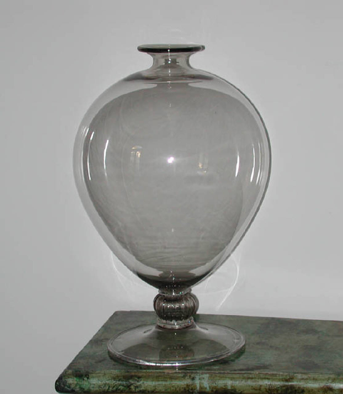 Vaso in vetro soffiato e lavorato a mano, color talpa, con grande corpo centrale a forma ovoidale, piede con orlo ribattuto, e gambo a nodo decorato da nervature ottenuto con la soffiatura a stampo. Realizzato dalla vetreria Venini di Murano su disegno di Vittorio Zecchin, il vaso ¿Veronese¿\n trae ispirazione dall¿esemplare cinquecentesco riprodotto accanto alla \nVergine nell¿Annunciazione di Paolo Veronese del 1578, esposta alle Gall\nerie dell¿Accademia di Venezia.