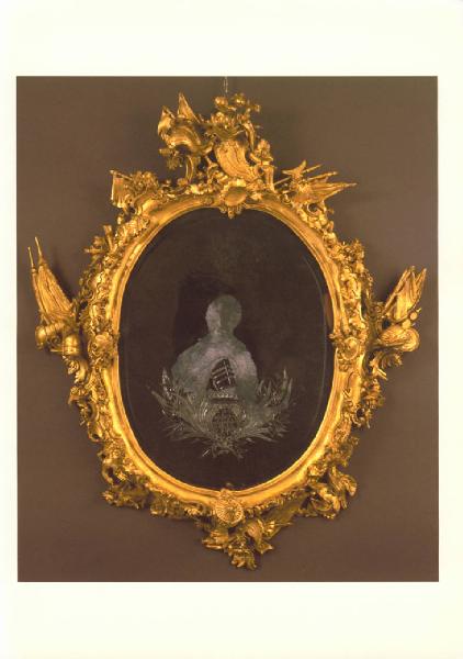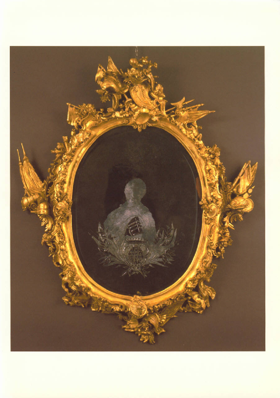 - NOTIZIE STORICO CRITICHE Piccola specchiera di legno scolpito, intagliato e dorato munita del proprio specchio inciso originale recante il ritratto e le armi di Francesco III d'Este