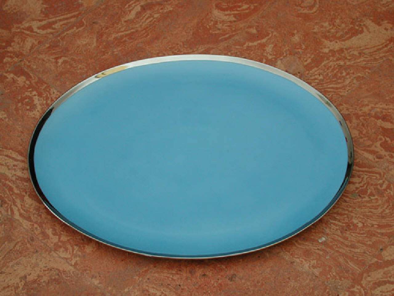 Vassoio ovale in porcellana dipinta, tamponata a mano color acquamare, disegnato e realizzato da Piera Crovetti.
