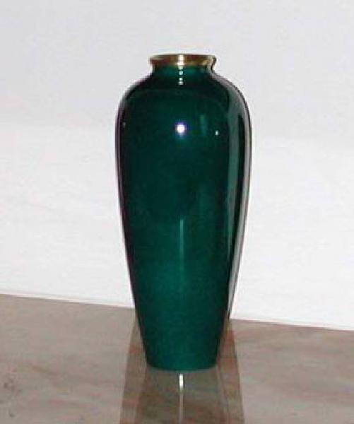 Vaso in porcellana Limoges tamponata a mano colore verde pavone. Il vaso, lavorato a mano con un decoro della bocca color oro zecchino, appartiene alla serie ¿Tre Manti¿ disegnata e realizzata da Piera Crovetti.
