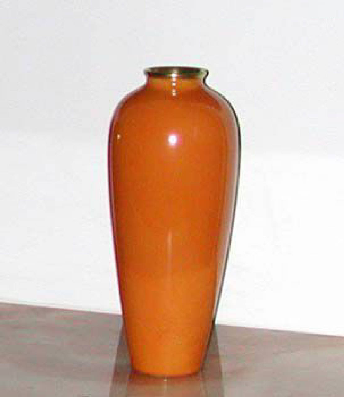 Vaso in porcellana Limoges tamponata a mano colore giallo polvere. Il vaso, lavorato a mano con un decoro della bocca color oro zecchino, appartiene alla serie ¿Tre Manti¿ disegnata e realizzata da Piera Crovetti.