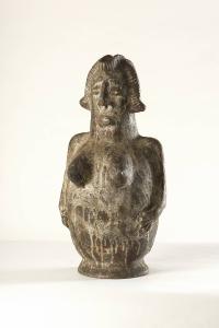 - NOTIZIE STORICO CRITICHE Primitivo Bambara, regione di Bougouni, Mali. Si veda l'expertise di Franco Monti allegato alla documentazione fotografica. Le forme (a partire dalla base che sostituisce la rappresentazione degli arti inferiori) sono quelle dei vasi, anche se qui la figura è piena e non c¿è cavità. Che si \ntratti di una figura femminile si desume dai seni e dall¿acconciatura a \ncinque trecce che la differenziano dall¿analoga figura maschile della Co\nllezione Panza che per il resto, volumi e tratti del volto, è invece molt\no simile. Il viso presenta grandi occhi a chicco di caffè, naso lungo e d\niritto con larghe narici, bocca ellissoidale aperta. Fra le trecce due orecchie in rilevo, ad arco di cerchio. Le braccia scendo aderenti al corpo per poi piegarsi in avanti con le mani a cingere il ventre. Le tracce di sostanze grondanti sulla superficie fanno supporre un uso sacrificale. Se la scultura in legno e quella in metallo sono in Mali e più in generale in \nAfrica una prerogativa maschile, la lavorazione della terracotta è invece\n un ambito prettamente femminile. Solo in pochissimi situazioni, come fra gli Hausa della Nigeria, sono gli uomini a produrre il vasellame, oppure a creare terrecotte figurative lasciando la produzione utilitaria alle donne. Nella maggior parte dei casi non viene fatta alcuna distinzione di principio fra statuaria in terracotta e vasellame e spesso anzi le due cose stanno insieme, la statuaria avendo come base il vaso e il vaso avendo come coperchio, tappo o imboccatura una figura. La lavorazione della terracotta rientra spesso tra le competenze richieste a ogni donna ma può assumere \nanche le caratteristiche di un¿attività professionale specializzata. Ne\nlle savane dell¿Africa occidentale le vasaie sono le mogli dei fabbri, l\na cui attività si trasmette ereditariamente. In Mali l¿arte della terra\ncotta risale indietro nel tempo con testimonianze archeologiche che nel Delta interno del fiume Niger (il triangolo Ke Macina, Mopti, Djenné) hanno\n potato alla luce una statuaria dalla ricca iconografia, forse utilizzata nell¿ambito di culti famigliari e di offerte votive per la guarigione da\n malattie, risalente al IX secolo e che avrebbe avuto fine nel XV per effetto della penetrazione islamica. (Ivan Bargna)