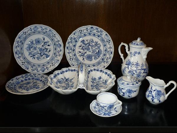 Servizio da tavola così composto: una caffettiera, una lattiera, una zuccheriera, sei tazzine da caffè con relativi piattini, sette piatti fondi, quattordici piatti piani, otto piatti per il dolce, una insalatiera, un piatto da portata, una antipastiera.\nLa porcellana bianca e blu con la decorazione "a cipolla" è uno dei prodotti più famosi della Repubblica Ceca.