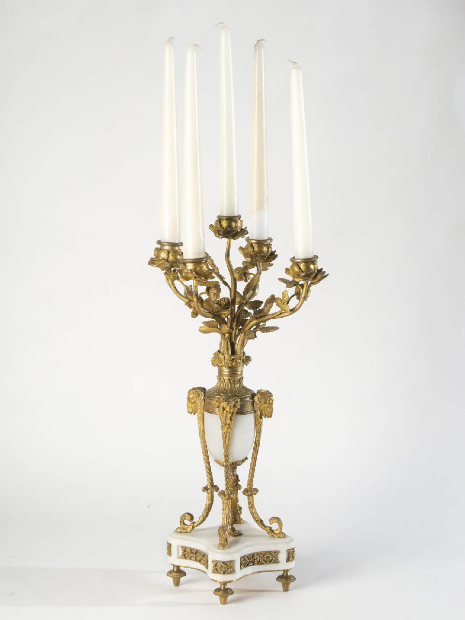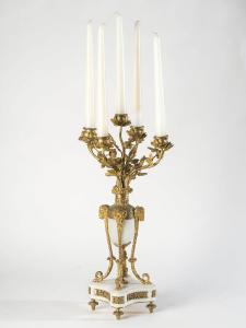Coppia di candelabri a cinque fiamme in bronzo dorato e marmo bianco.