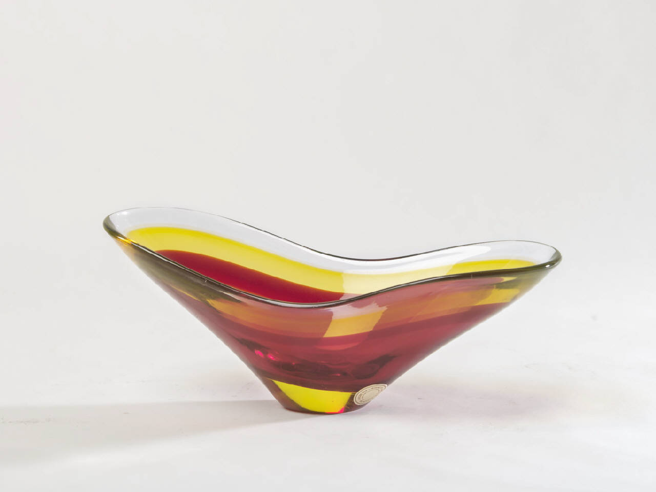 Vaso centrotavola in vetro di Murano di forma allungata, nelle tonalità rosso rubino, giallo e verde.