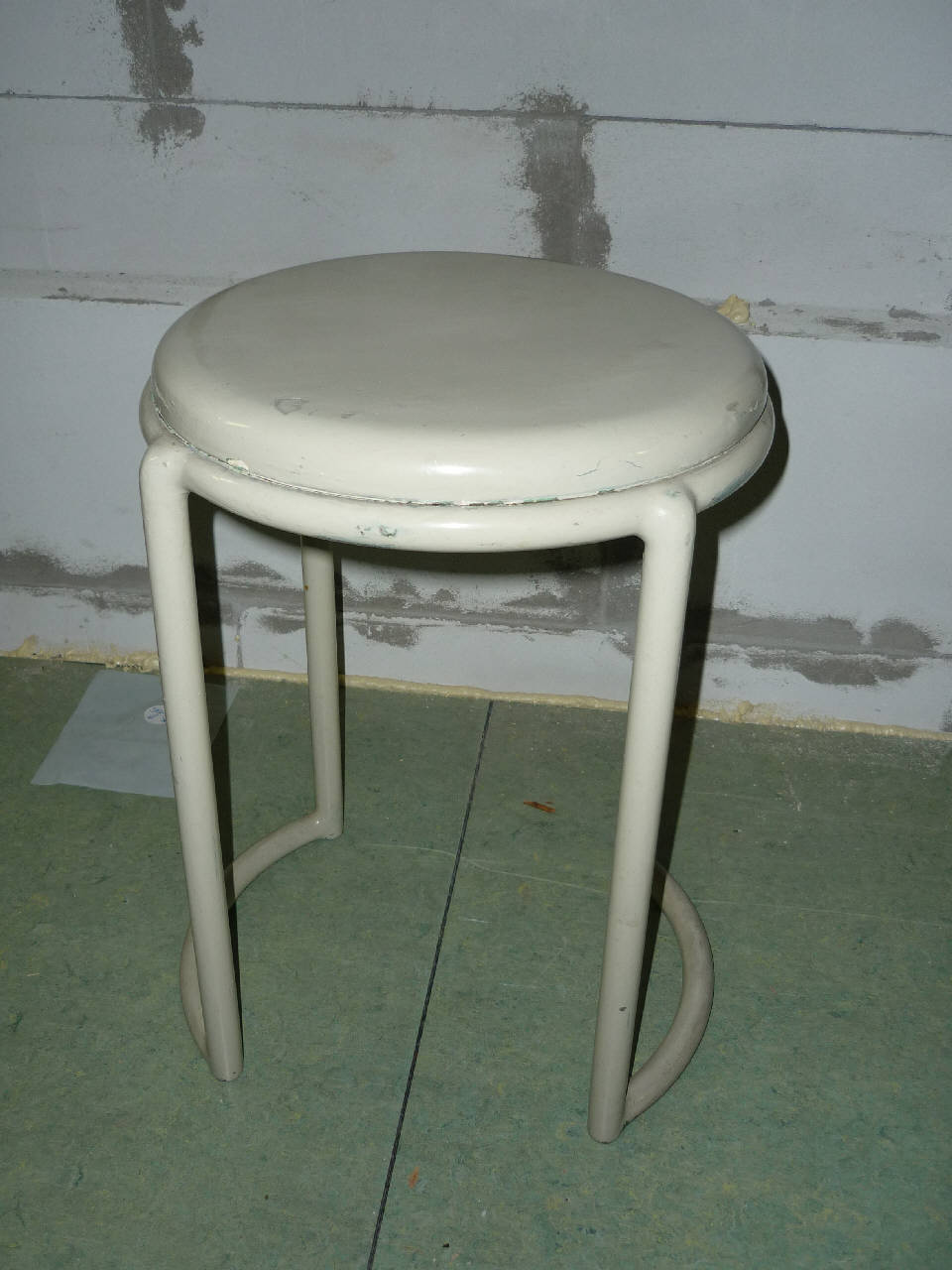 Semplice sgabello con piano d'appoggio in legno; struttura portante in ferro.