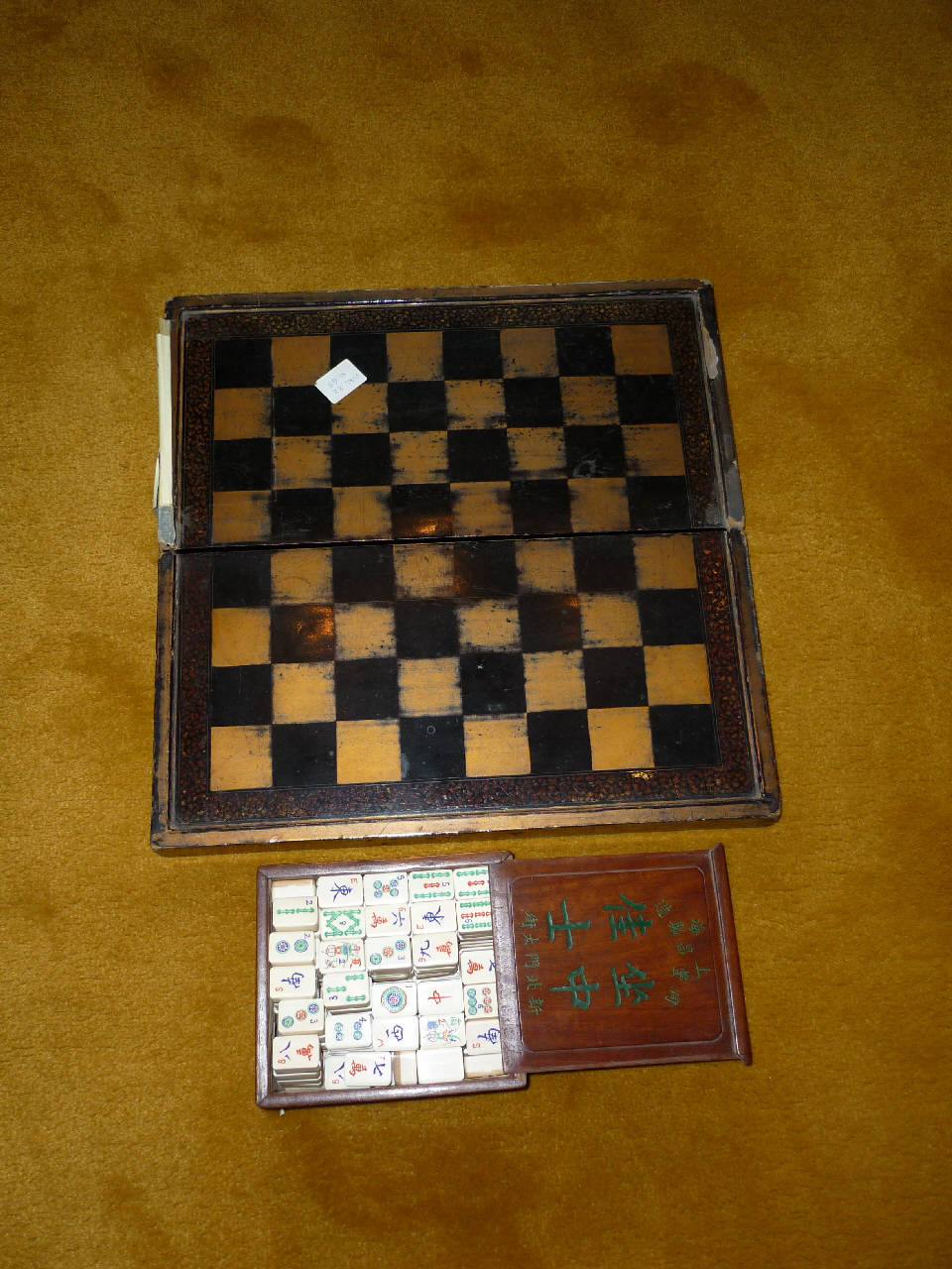 Gioco da tavolo in legno e avorio unito ad una scacchiera.