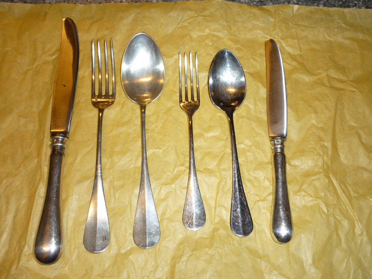 Servizio di posate in argento con manico liscio composto da: 16 coltelli, 8 forchettine, 8 forchette, 8 cucchiai, 2 cucchiai da colazione.