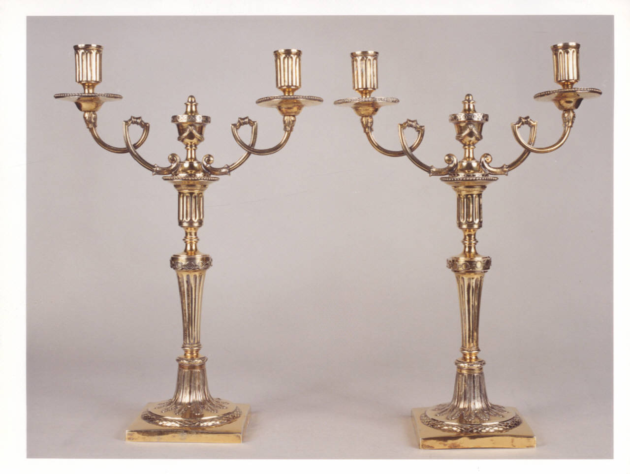 Coppia di candelabri a due fiamme con fusto a balaustro. I due bracci, terminanti nei due portacandele, sono mossi al centro da un ricciolo. Il piede tondo poggia su base quadrata.