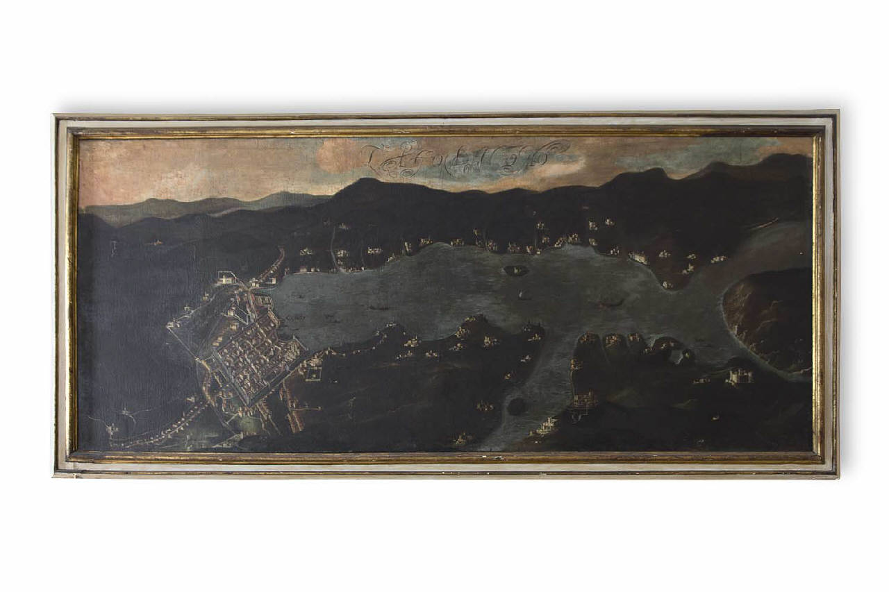 Il dipinto, a olio su tela, raffigura una "Veduta del lago di Como" e risale al XVII secolo. Di grande formato rettangolare, è orientato in orizzon\ntale e dotato di una cornice in legno bianco e dorato.