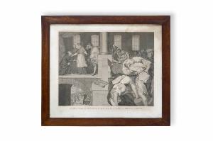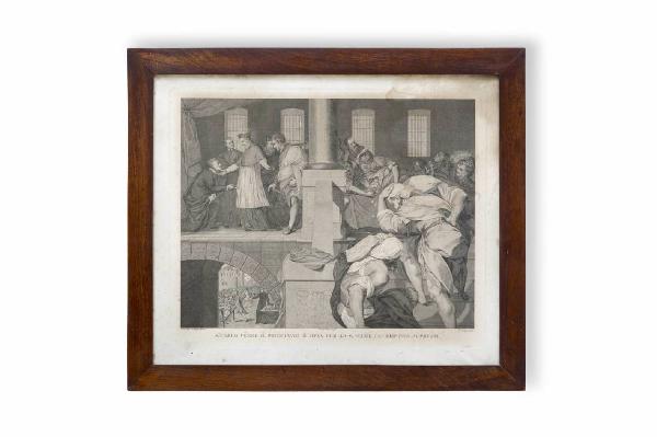 La stampa di traduzione è opera di Paolo Caronni (1779-1842) e riproduce \nun dipinto di Giovan Battista Crespi detto Cerano (1573-1632), realizzato nel 1602 per il Duomo di Milano e raffigurante "La distribuzione ai poveri, da parte di San Carlo Borromeo, del provente della vendita del principato d'Oria". Databile al primo quarto del XIX secolo, è di formato rettango\nlare orientato in orizzontale; è dotata di una semplice cornice in legno \nscuro.