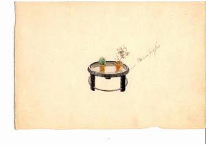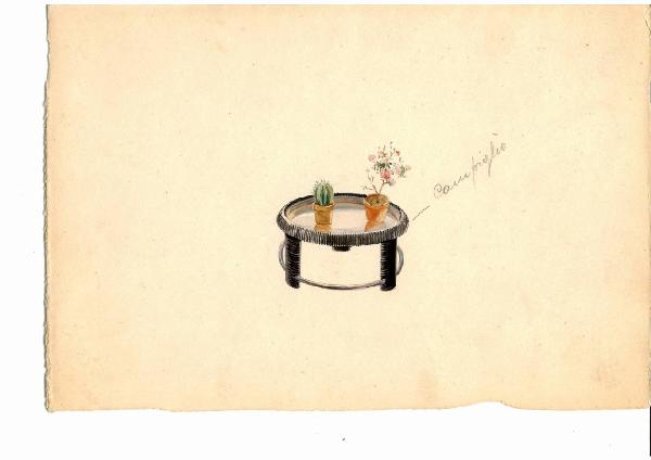 Disegno su cartoncino acquerellato con tavolino circolare su cui sono appoggiati due vasetti di piantine.
