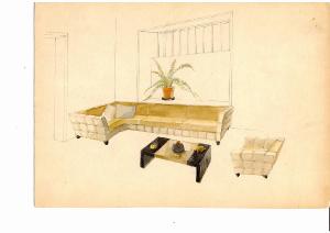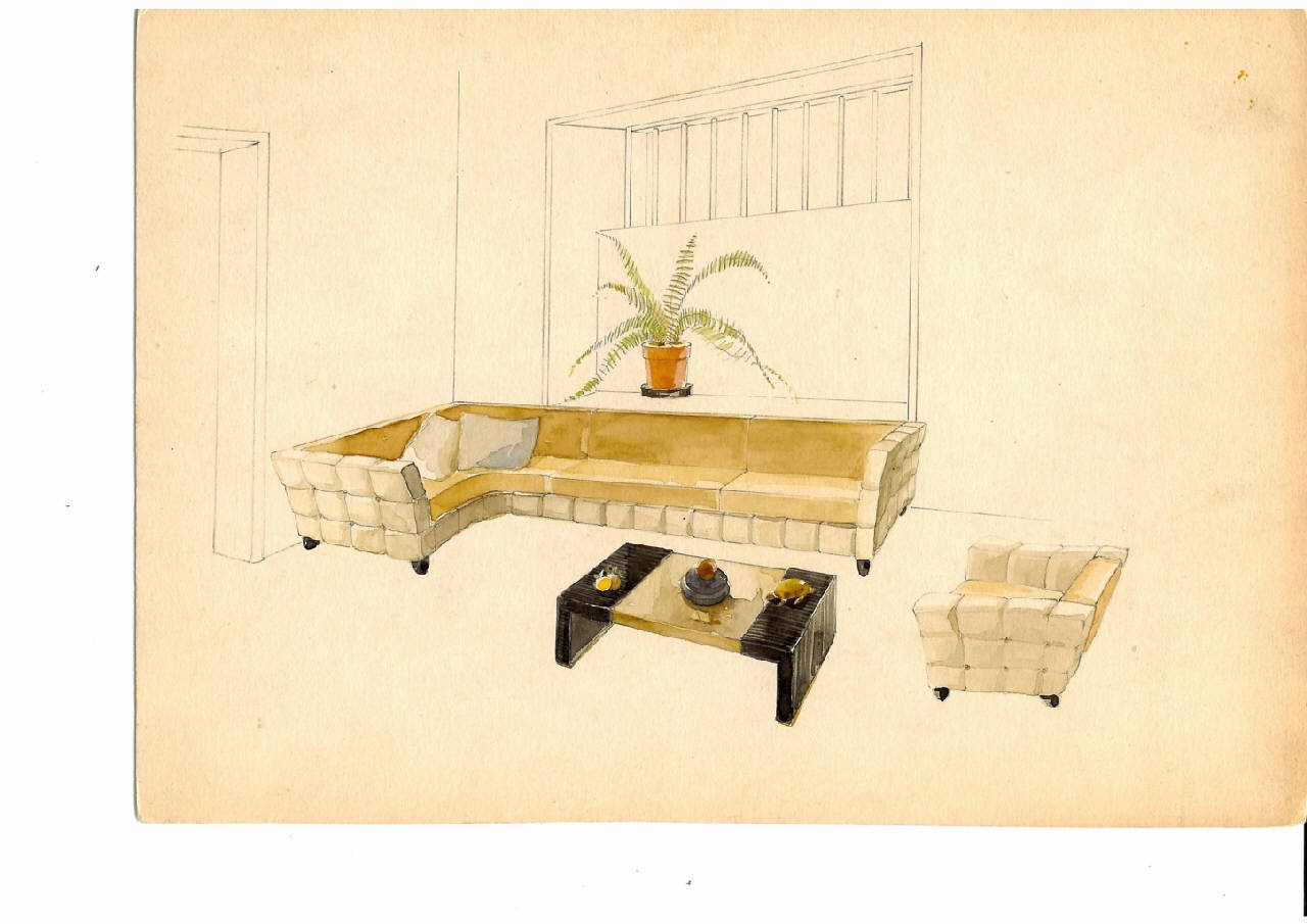 Disegno su cartoncino acquerellato con divano ad angolo, poltrona e basso tavolino.