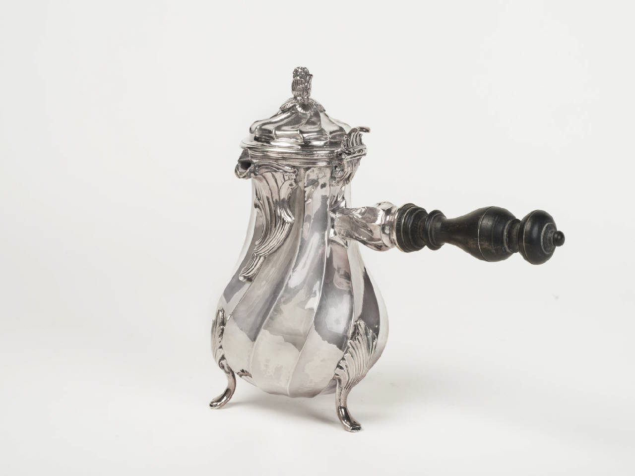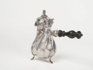 Piccola cioccolatiera in argento con manico laterale in legno tornito, corpo leggermente a torchon con versatoio mosso, tre piedini e presa del coperchio a forma di bocciolo.