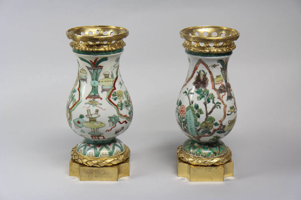 Coppia di vasetti a balaustro in porcellana di Cina, con decoro a fiori e oggetti entro riserve, basi e montature sul bordo francesi in bronzo cesellato e dorato.