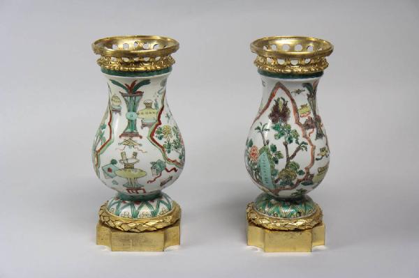 - NOTIZIE STORICO CRITICHE La coppia di vasetti, donata insieme ad altre diciotto opere al FAI nel 2013, proviene dalla collezione di Angelo Zegna. Le opere - suppellettili e ceramiche - sono collocate al piano terra della villa, tra Biblioteca, Salone, Sala da Pranzo e Veranda. I vasetti presentano un'ampia decorazione figurativa sul corpo del vaso, con motivi floreali e numerosi oggetti. Realizzati in Cina, sono un esempio di porcellane della Famiglia Verde, stile di decoro nato qui nella seconda metà del XVII secolo e caratterizzato da colori forti (prevalentemente un verde brillante, un rosso-corallo opaco, smalto blu e smalti di colore melanzana, giallo e nero). Le montature in bronzo dorato risalgono allo stile francese Luigi XVI.