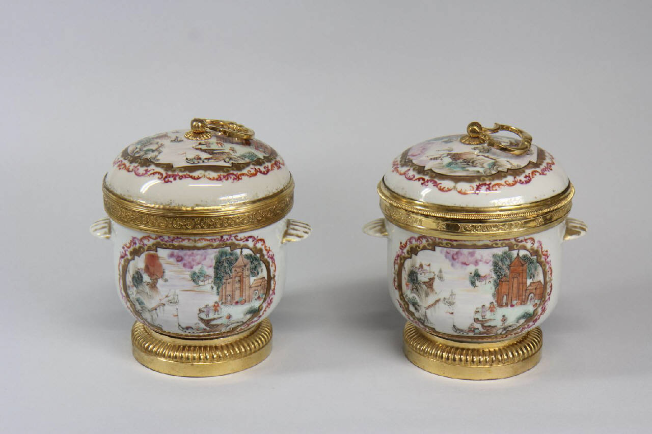 Coppia di vasetti con coperchio cilindrici in porcellana con decoro a paesaggi policromi entro riserve, con montature in bronzo dorato.