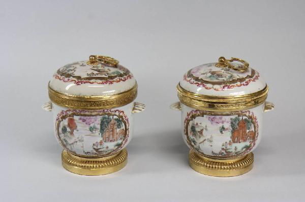 - NOTIZIE STORICO CRITICHE La coppia di vasetti, donata insieme ad altre diciotto opere al FAI nel 2013, proviene dalla collezione di Angelo Zegna. Le opere - suppellettili e ceramiche - sono collocate al piano terra della villa, tra Biblioteca, Salone, Sala da Pranzo e Veranda. I vasetti presentano un'ampia decorazione figurativa sul corpo del vaso, che si ripete identica sul coperchio: si distingue una veduta su un porto, a destra un edificio e alcune figure stanti, alcune barche che approdano. Si tratta di un esempio di porcellana "Compagnia delle Indie", tipologia di porcellane cinesi realizzate esclusivamente per l'esportazione verso l'Europa e pertanto fortemente adeguate al gusto europeo. Le montature in bronzo dorato sono francesi, in stile Luigi XIV (stile simmetrico e massiccio).