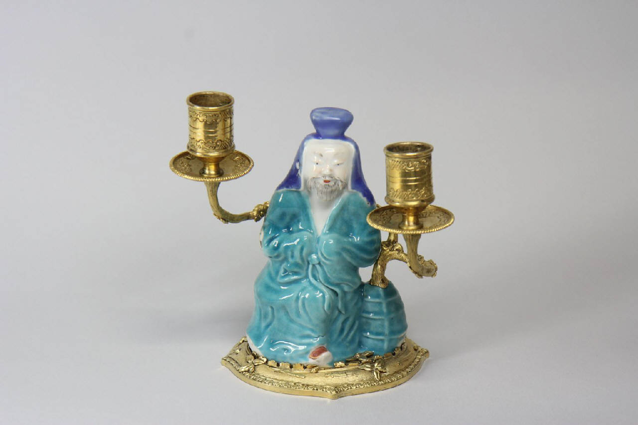 - NOTIZIE STORICO CRITICHE Il candeliere, donato insieme ad altre diciotto opere al FAI nel 2013, proviene dalla collezione di Angelo Zegna. Le opere - suppellettili e ceramiche - sono collocate al piano terra della villa, tra Biblioteca, Salone, Sala da Pranzo e Veranda. Si tratta di un candeliere di produzione francese, esemplare di epoca Reggenza (stile tra Luigi XIV e Luigi XV), con una figura maschile barbuta con veste turchese e copricapo blu, molto simile ai due candelieri appartenenti alla stessa collezione. Un bollo sul retro della statuina suggerisce il passaggio del candeliere presso l'antiquario Pietro Accorsi a Torino; il medesimo bollo è collocato su uno dei due candelieri retrostanti.