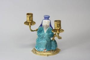 Candeliere francese a due fiamme in bronzo cesellato e dorato con figura in porcellana di Cina maschile barbuta con veste turchese e copricapo blu; base decorata.