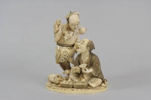 Piccola scultura in avorio raffigurante due personaggi maschili venditori di pesci, su base ovale, firmata sotto la base.